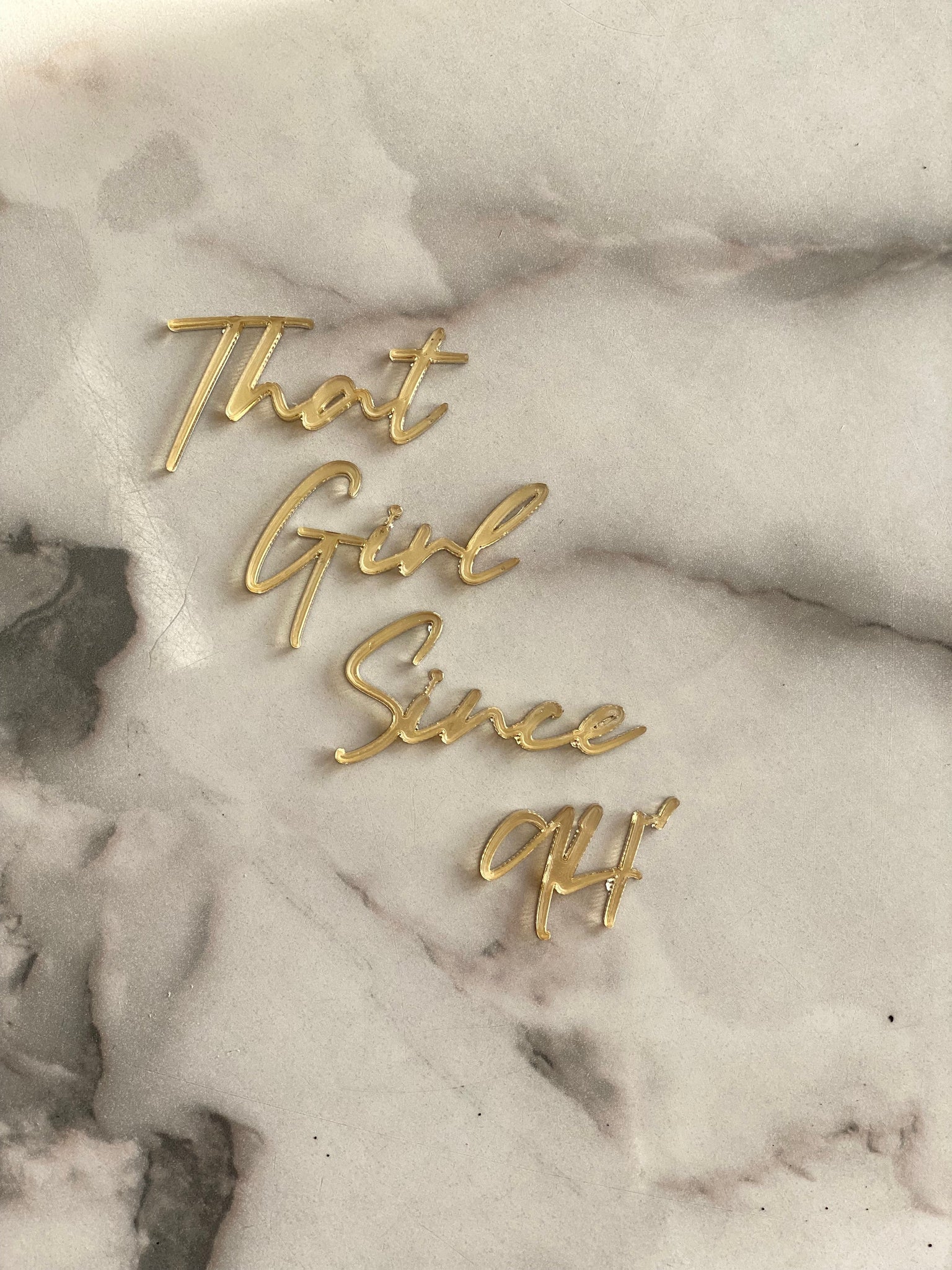 You'r what? "That Girl Since 94'" Cut in acrylic or acrylic mirror with our laser-cutter machine. Available in different colors and finishes to match your theme.