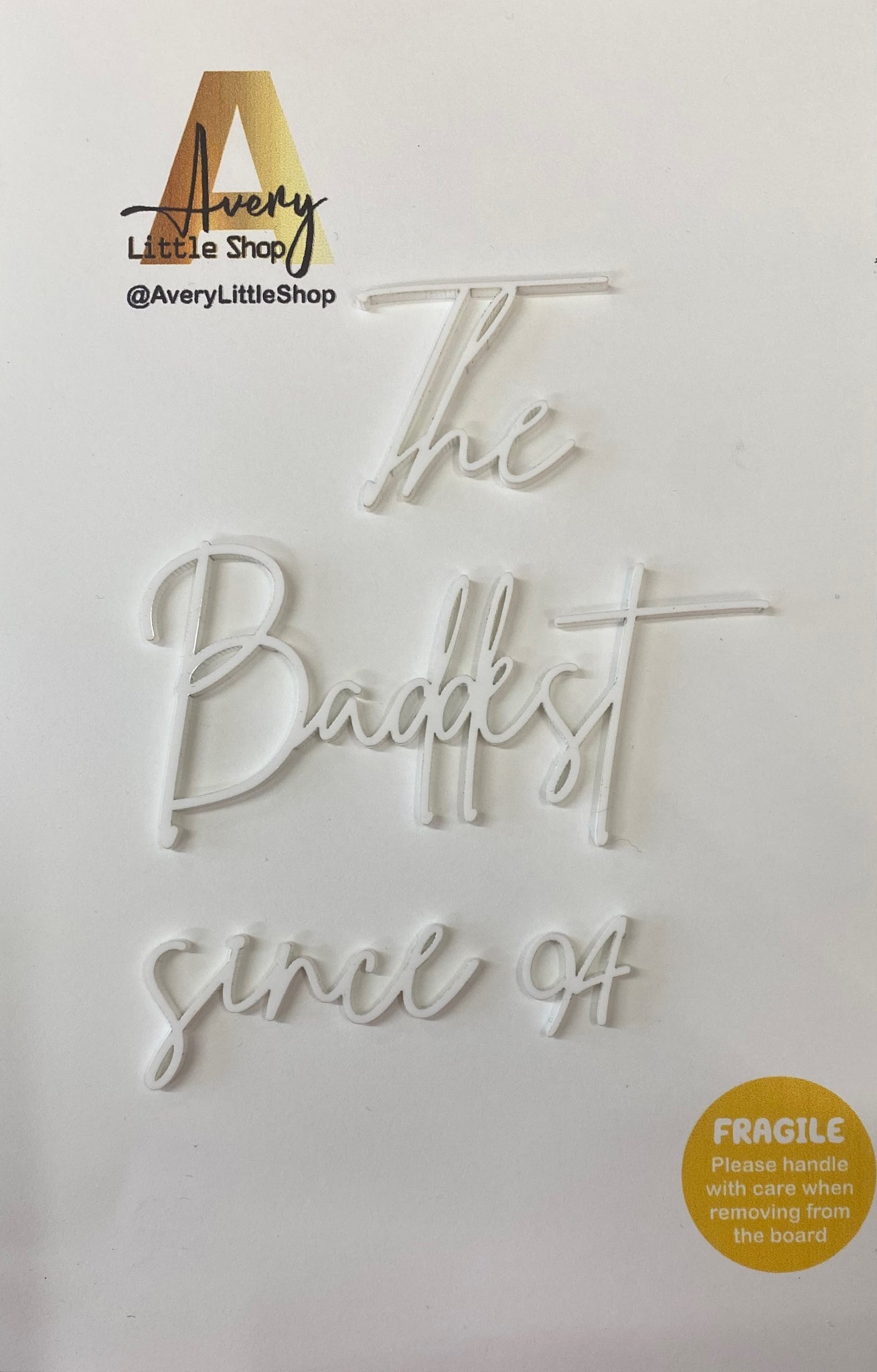 You'r what? "The Baddest Since 94'" Cut in acrylic or acrylic mirror with our laser-cutter machine. Available in different colors and finishes to match your theme.